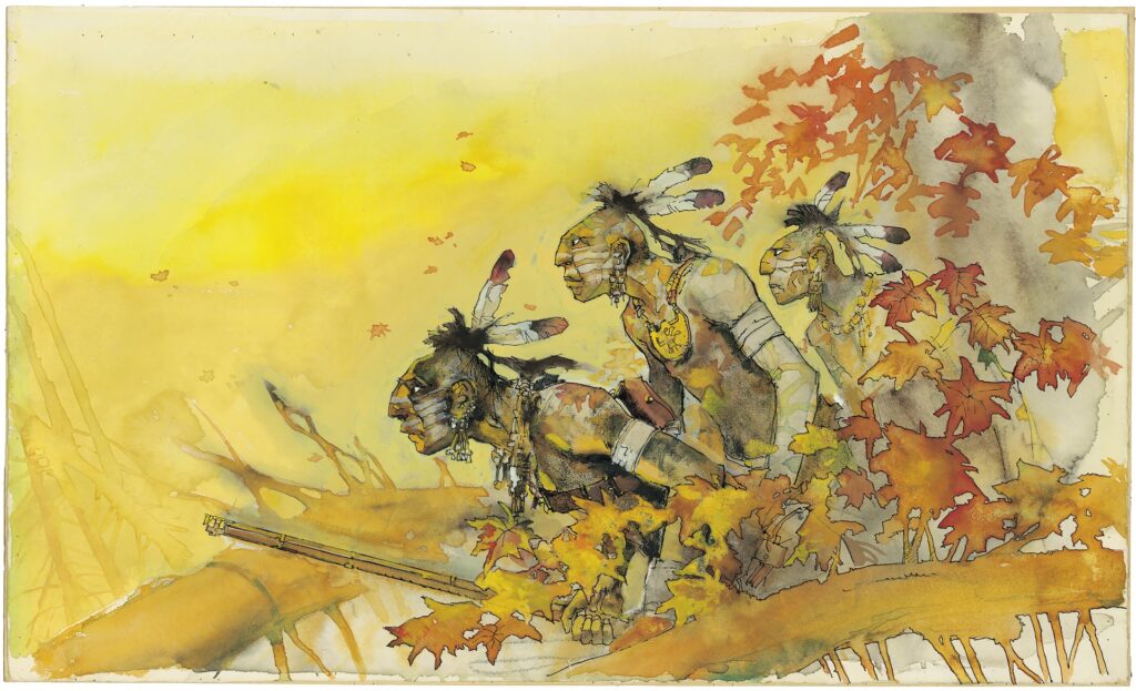 On a beaucoup vu Hugo Pratt, à une période, dans les campagnes reculées de la Province de Liège. Il était souvent accompagné d’un garçon à la barbe foisonnante qui ne le quittait pas d’une semelle. Aussi, peut-on dire, avec beaucoup de mauvaise foi, que le père de Corto Maltese était un peu un enfant du pays ! Son amitié avec Comès l’a amené à s’intéresser non seulement au travail du père de Silence et de La Belette, mais plus généralement à la Bataille des Ardennes. Les deux hommes se sont pour ainsi dire trouvés. Différents – l’un était aussi taiseux que l’autre était exubérant -, ils se ressemblaient cependant sur bien des points et nourrissaient des passions communes pour la musique, le noir et blanc ou le temps suspendu.